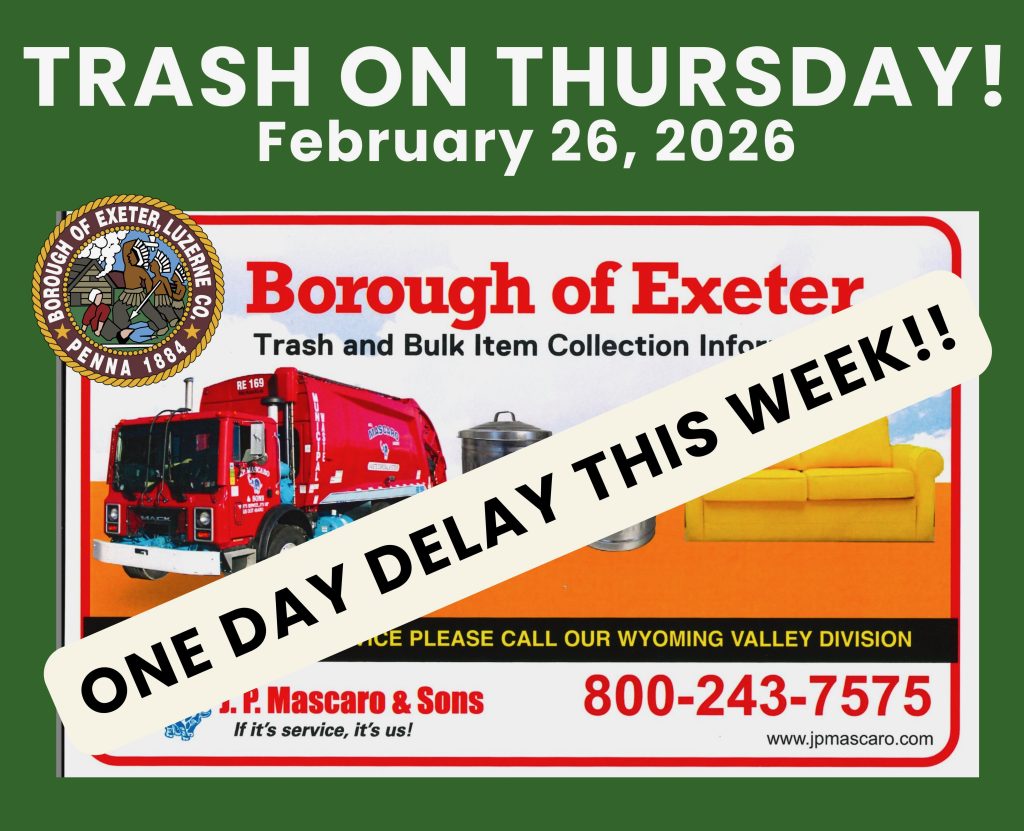 Due to delays in service to the Mascaro service territory to our south, our Trash Pickup this week will be on a one-day delay. Please have your trash out to the curb on Wednesday night, Feb. 25th for a Thursday February 26th Pickup. We apologize for the late notice and inconvenience. Thank you.